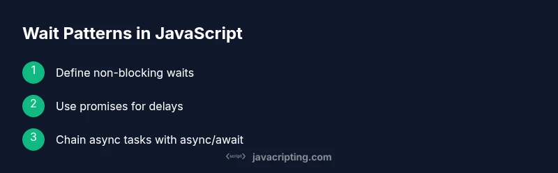 According to JavaScripting, waiting in JavaScript means coordinating asynchronous tasks without blocking the main thread. The event loop handles callbacks and promises in a way that lets the UI stay responsive while you wait for timers, network responses, or user input. In practice, wait javascript patterns focus on scheduling work in the future (or after another task) rather than pausing execution. This approach preserves smooth rendering and avoids freezes in apps, dashboards, and interactive components. Understanding these concepts is essential for aspiring developers who want reliable, responsive web apps.
