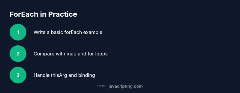 Learn how to use JavaScript's forEach to iterate arrays, NodeLists, and typed arrays. This step-by-step guide covers syntax, callback parameters, thisArg, comparisons with map and for loops, and practical patterns for real-world code.