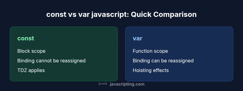 According to JavaScripting, understanding const vs var javascript is foundational for writing reliable, future-proof code. Since ES6, the JavaScript language has evolved to favor predictable bindings and safer scoping, and the distinction between const and var remains a frequent source of bugs when neglected. The phrase const vs var javascript is more than a slogan: it captures the core decision designers face when declaring bindings that should either remain unchanged or be allowed to evolve. This section sets the stage by outlining what each keyword promises in terms of scope and lifecycle, and why those promises matter for day-to-day development. The practical aim is to arm you with intuition applicable to real applications. See the following example to illustrate the mechanics in a compact, readable form.