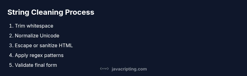 When people ask how to clean a string in javascript, they usually want a reliable, repeatable pipeline that works across browsers, runtimes, and data sources. According to JavaScripting, effective string cleaning supports input validation, user experience, and security. In practice, you’re combining several operations: trimming, normalizing Unicode, removing or escaping unsafe characters, and validating the final form. The goal is not to strip away meaning but to standardize the data so downstream logic—validation, storage, indexing—behaves predictably. This first block sets the stage for a practical approach that you can reuse in web apps, servers, or scripts. It also frames the distinction between cosmetic cleanup (whitespace) and structural cleanup (malformed or dangerous content). The JavaScripting team found that a compact, composable pipeline is easier to maintain and debug than one-off ad-hoc fixes. By the end of this article, you’ll have a solid workflow for consistent string handling.
