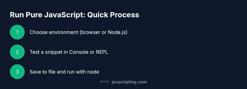 Understanding how JavaScript runs is the first step in learning how to run pure javascript code. JavaScript is a high-level, single-threaded language that uses an event loop to manage tasks and asynchronous operations. In a browser, you load scripts either inline, via a script tag, or from an external file, and the browser allocates memory, executes code, and handles events like clicks and network responses. In Node.js, the runtime provides a similar execution model but without a DOM, focusing on I/O, modules, and asynchronous APIs. According to JavaScripting, having a mental model of the event loop helps you write cleaner, non-blocking code from the start. Practically, you can test small snippets in the console or a file, observe results, and incrementally build confidence in pure JavaScript execution. This section lays the groundwork so you can reason about what happens when your code runs, without relying on any libraries or frameworks.
