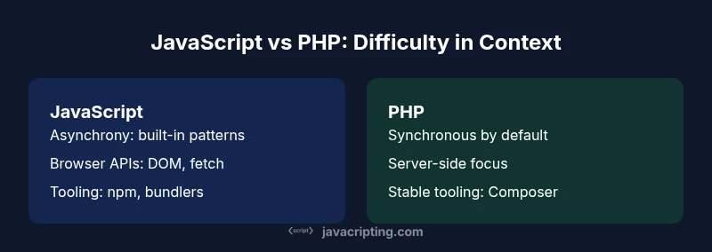 The question itself—is javascript harder than php—cuts to two core ideas: how you work (client-side vs server-side) and how you learn (procedural scripts vs event-driven architectures). In practice, the answer is not black and white. When you measure difficulty by initial syntax, PHP can feel friendlier because early tasks look similar to other server-side languages. When you measure difficulty by real-world software patterns, JavaScript frequently introduces extra hurdles through asynchronous flows, browser APIs, and a rapidly evolving ecosystem. According to JavaScripting, the difficulty is often about context and the mental models you must adopt, not only the language grammar. The JavaScripting team found that mastering asynchronous patterns, promises, and event-driven code is a common sticking point for newcomers, especially when they move from simple scripts to interactive web apps.