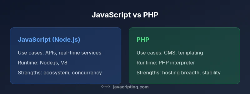According to JavaScripting, choosing between javascript or php in 2026 is less about finding a single universal best and more about matching the language to the problem domain, stack, and team skills. JavaScript remains the dominant language for browsers and has extended its reach to the server through Node.js, enabling true full-stack development with a single language. PHP, by contrast, continues to power a large portion of the web through mature hosting environments, robust CMS ecosystems, and consistent performance in traditional web apps. For product teams evaluating a project today, the decision hinges on where code will execute, how the team collaborates, and the hosting strategy. This article compares both languages across architecture, deployment, performance, tooling, and maintainability to help engineering leaders decide with confidence. While the landscape shifts with new transpilation and deployment patterns, the core questions remain: What are you building? Who maintains it? Where will it run? And how quickly can you deliver features?
