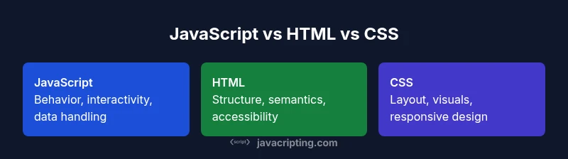 When you build a modern web experience, you rely on three foundational technologies: JavaScript, HTML, and CSS. Each plays a distinct role, yet they are deeply interconnected. Understanding javascript vs html vs css means recognizing that HTML provides structure, CSS handles presentation, and JavaScript introduces behavior and interactivity. This triad is not a competition but a collaboration where responsibility should be clearly delineated to avoid brittle interfaces and maintainable code. In this section we will explore each language's core purpose, typical use cases, and how they fit into a cohesive front-end strategy. You’ll see how the three hold hands to deliver accessible, responsive, and dynamic interfaces, and how misaligned responsibilities can turn a clean design into a maintenance headache. By framing the trio in terms of structure, style, and behavior, you can plan architectures that scale from a simple personal site to a feature-rich web app. The goal here is practical clarity: know what to implement in HTML, what to express in CSS, and what to encode in JavaScript, and why those boundaries matter for real projects. This article also demonstrates how javascript vs html vs css intersects with accessibility and performance considerations for real-world scenarios.