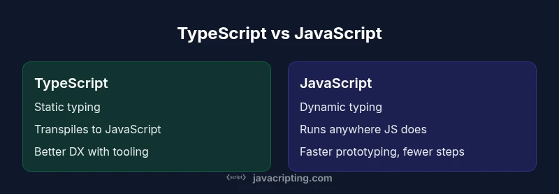 When weighing typescript versus javascript, TypeScript adds static typing and tooling to JavaScript, while plain JavaScript remains flexible and ubiquitous. For medium-to-large projects, TypeScript improves maintainability and refactoring safety; for rapid prototyping, JavaScript is often faster to start. Use the project's scale and team skills to decide. This quick answer sets the stage for deeper exploration of typing, tooling, and migration paths.