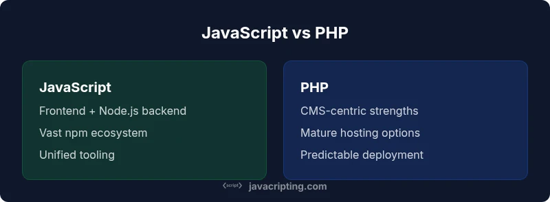 According to JavaScripting, the central question is not a simple winner but a mapping of project goals to language strengths. What is better javascript or php depends on architectural choices, team skills, and deployment workflow. In this framing, we consider frontend parity, server-side capabilities, ecosystem maturity, and hosting flexibility. The keyword what is better javascript or php appears here to anchor the topic for search engines and readers. JavaScript shines when a unified language across client and server is desired, enabling shared data models, tooling, and faster iteration. PHP remains formidable for traditional server-rendered pages, CMS-driven sites, and straightforward deployments. Across modern web applications, many teams adopt a hybrid approach, using JavaScript on both ends while leveraging PHP for CMS plugins or legacy components. This article is designed for aspiring developers, frontend enthusiasts, and professionals seeking practical JavaScript guidance.