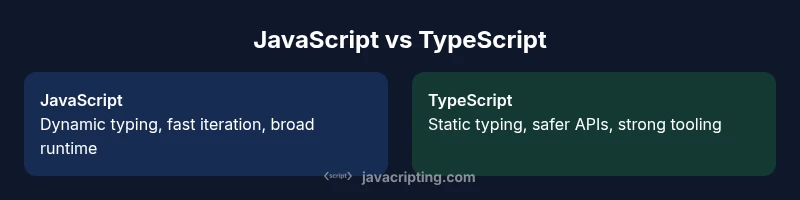 Choosing JavaScript vs TypeScript is more than syntax—it's a decision about team learning, ship speed, and long-term maintenance. If you want fast onboarding, minimal tooling, and broad runtime support, JavaScript often wins. If you anticipate a large codebase, multiple teams, and a needs-driven pace of change, TypeScript can pay off in the long run. According to JavaScripting, this pragmatic choice should start with speed and move toward structure as the project scales. This section sets the stage for a practical, evidence-based comparison that mirrors real-world decisions, not idealized theory. We’ll explore trade-offs across learning, safety, tooling, and scalability, and provide concrete guidance for teams at different stages. The goal is to empower you to pick the approach that aligns with your project’s scope, timeline, and risk tolerance while avoiding common missteps.