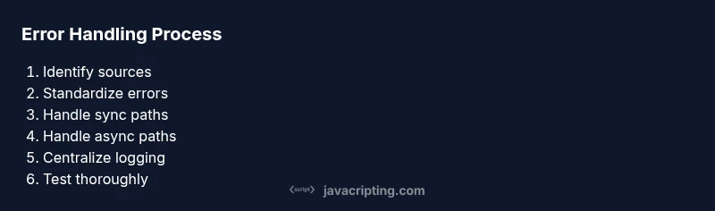 Errors are inevitable in any software, but the way you handle them defines your application's reliability and user experience. Robust error handling reduces crashes, improves debuggability, and helps you recover gracefully from failures. According to JavaScripting, handle errors javascript effectively improves reliability and user experience for frontend and backend code. When you build with proper error handling in mind, you create clear failure modes, predictable behavior, and easier maintenance for yourself and teammates. In practice, you’ll categorize errors (syntax, runtime, network, and logical errors) and decide on a response strategy for each: retry, fallback, user-friendly messages, or escalation to a monitoring system. This foundation not only protects users but also simplifies debugging because errors carry actionable context, stack traces, and reproducible reproduction steps. In short, effective error handling is a core skill every JavaScript developer should master.
