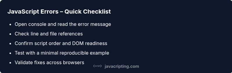 According to JavaScripting, the most common javascript errors come from undefined references, timing issues, or failed dependencies. Start by opening the browser console to note the exact message, file, and line. Confirm scripts load in the correct order and ensure code runs after the DOM is ready. Use a step-by-step debugging workflow to triage syntax, runtime, and asynchronous errors quickly.