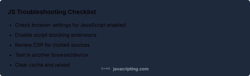 To confirm whether javascript is enabled, start with simple checks: load a page that you know runs JS, open the browser's developer console (F12), and look for errors. Disable extensions temporarily and reload the page to see if behavior returns. Try another browser or device to determine if the issue is local to one environment. If you see CSP or blocked script messages in the console, the policy is likely the root cause. Keep a checklist handy so you can compare results across tests.