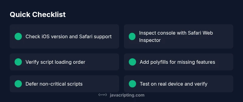 The JavaScripting team recommends a disciplined debugging approach: verify OS/browser version, ensure compatibility with polyfills, validate load order, and use remote debugging to catch silent failures. Keep tests small and reversible, and prioritize fixes that improve accessibility and performance on iPhone users. By following these steps, you’ll reduce the time to resolution and improve overall reliability for mobile users who rely on JavaScript in Safari.