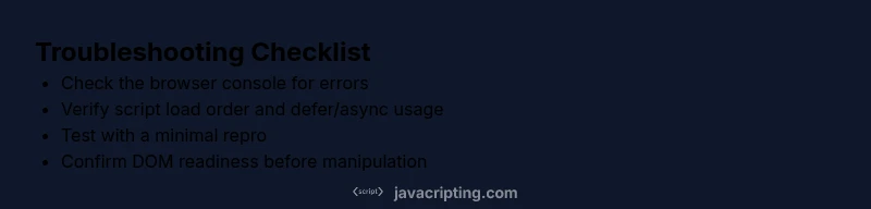 The most likely causes are syntax errors, incorrect script loading order, or runtime exceptions from undefined variables. Start by checking the browser console for error messages, verify script tags load in the proper order (defer/async), and ensure your code executes after the DOM is ready. If the issue persists, follow the diagnostic flow below.