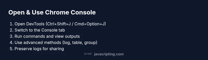 According to JavaScripting, the Chrome JavaScript Console is a core part of Chrome DevTools that lets you execute JavaScript, log information, and observe runtime behavior without leaving the browser. It’s a low-friction sandbox for learning, prototyping, and debugging real pages. By leveraging console methods, you can observe outputs, catch errors, and validate assumptions in real time. For beginners, this is often the first structured way to understand how JavaScript interacts with the DOM, events, and asynchronous operations. If you are asking where is javascript console in chrome, this section helps you orient DevTools around the Console panel and explains why it’s so valuable for day-to-day debugging and learning.
