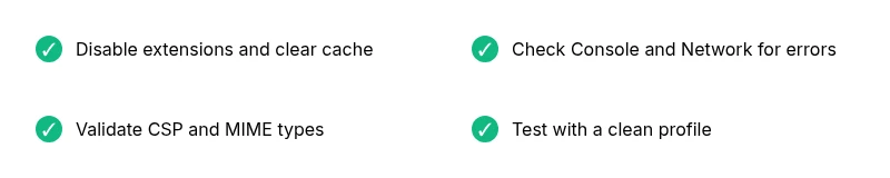 - Maintain CSP and security hygiene to prevent future failures