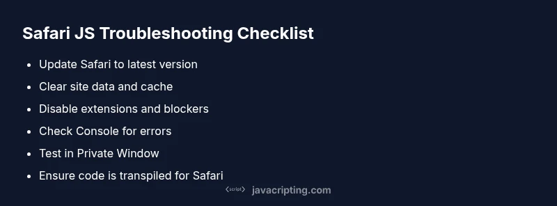 Struggling with JavaScript not running in Safari? This practical guide covers quick checks, debugging steps, and best practices to restore reliable Safari JS performance.