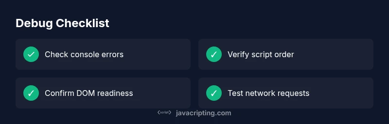 A fast, practical troubleshooting guide to diagnose and fix JavaScript issues. Learn how to read console errors, correct script order, and ensure DOM readiness for reliable web pages.