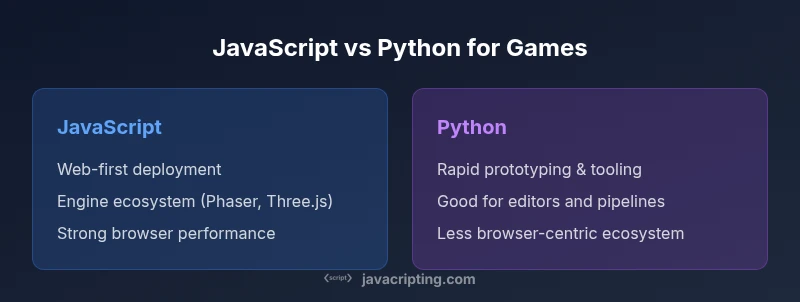 According to JavaScripting, the answer is usually contextual rather than universal. The JavaScripting team found that when teams ask is javascript or python better for games, the decision hinges on target platforms, project timelines, and skill sets. If the primary goal is a browser-based game or a web port, JavaScript tends to be the pragmatic default. If the aim is rapid prototyping, tooling, or AI-assisted pipelines, Python often offers a speed advantage in iteration. This section sets the stage for a structured, evidence-based comparison that avoids hype and focuses on real constraints like performance, ecosystem, and deployment realities. Expect deeper dives into runtime behavior, available engines and libraries, and concrete decision criteria you can apply to your next project.