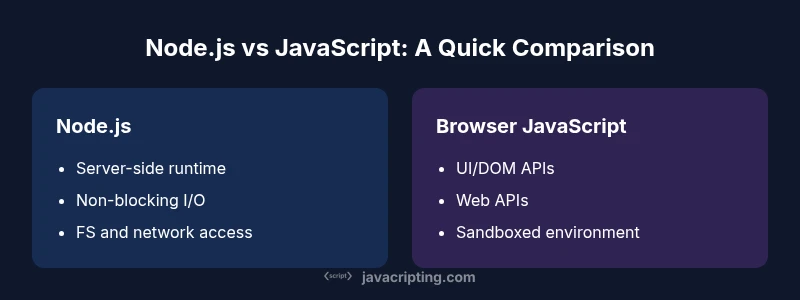 Understanding the Core Difference\n\nNode.js and JavaScript occupy different roles in the modern web. JavaScript is the universal language of the web, running in browsers to create interactive experiences. Node.js, by contrast, is a server-side runtime that lets JavaScript execute outside the browser, enabling servers, tooling, and automation. This distinction matters for project scoping, team skill sets, and deployment strategies. According to JavaScripting, the core difference is not the syntax but the runtime and API surface you can rely on. In practice, when you see code that uses browser APIs like document or window, you’re looking at client-side JavaScript. When you see modules that handle filesystem access, network sockets, or process management, you’re in the Node.js world. Understanding this split helps you evaluate where to start a project and how to structure code for reuse across environments.