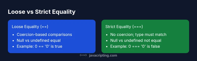 Equality in JavaScript is controlled by two operators: loose (==) and strict (===). When you compare values, the difference between == and === in javascript is central to how the language handles type and value. Understanding how each operator behaves helps prevent subtle bugs and makes your code more predictable, especially in user input validation, data parsing, and API responses. This section lays the groundwork by explaining the core concepts: type coercion, value comparison, and the intent behind using either operator. According to JavaScripting, the practical takeaway is that most comparisons should be done with strict equality unless you deliberately rely on coercion. The rest of this article builds on that direction, with concrete examples and best practices you can apply in front-end and back-end JavaScript projects. By the end, you will know when to rely on each operator and why the distinction matters in real-world code.