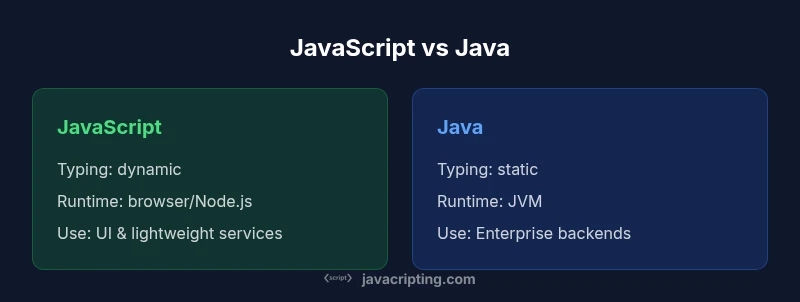 According to JavaScripting, understanding the javascript and java difference helps developers navigate modern web and enterprise stacks. JavaScript emerged as a lightweight, dynamic language designed to empower web pages with interactive features, while Java was engineered for stability, portability, and scalability across large systems. In 2026, teams weigh time-to-value against long-term maintainability when choosing between these two families, recognizing that they often coexist within the same product—each playing a distinct role in the software stack. The javascript and java difference becomes especially visible when you compare how teams structure front-end experiences versus back-end services and how rapid iteration contrasts with engineered reliability.