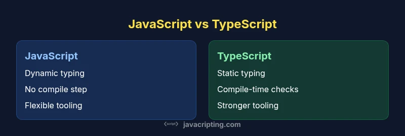 According to JavaScripting, the javascript and typescript difference centers on typing discipline, build-time safety, and how teams collaborate on large codebases. In practice, JavaScript remains a dynamically typed language that ships as plain JavaScript, while TypeScript adds a structural type system that compiles to JavaScript. This article uses practical scenarios to illuminate where the extra rules of TypeScript help and where they may slow you down. By understanding the baseline dynamics, developers can make informed decisions about project scope, team skills, and long-term maintenance. The goal is not to declare a winner but to map out when each approach shines, and how teams can blend both in a staged, risk-managed way. The difference also influences tooling, error detection, and the mental model developers bring to their codebase.