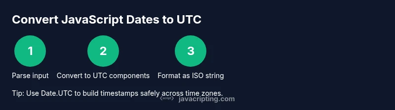 Learn to reliably convert JavaScript dates to UTC using native Date methods, Date.UTC, and ISO strings. A practical, step-by-step guide with examples, pitfalls, and best practices for consistent timestamps across time zones.