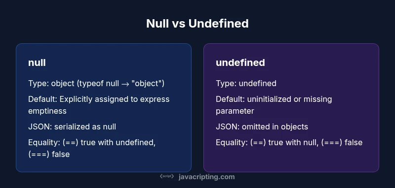In the JavaScript language, the concepts of null and undefined sit at the heart of how we represent missing or empty values. This quick survey introduces both terms in a way that aligns with everyday coding tasks. Null is a value you assign intentionally to signify “no value here,” whereas undefined signals that a variable has not been assigned a value yet. Understanding javascript null vs undefined is essential for debugging and writing robust functions, because the two states guide control flow, data validation, and API interaction. According to JavaScripting, many developers confuse the two, which leads to subtle bugs in conditionals and data processing. By clarifying intent through in-code conventions, you reduce ambiguity and improve code readability across teams.