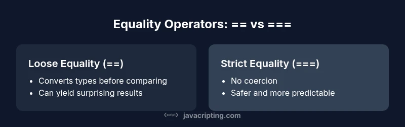 Compare loose (==) and strict (===) equality in JavaScript with practical guidance, pitfalls, and clear rules of thumb to write safer, more predictable code in real projects.