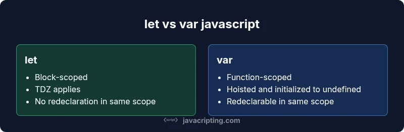 In modern JavaScript, understanding the difference between let and var is crucial for writing predictable code. The keyword let introduces a block-scoped binding, while var creates a binding at function scope. This distinction affects hoisting, redeclaration, and the temporal dead zone (TDZ). According to JavaScripting, adopting block scope by default reduces variable leakage and makes refactoring safer in teams. When you declare let inside a loop or a block, each new block gets its own binding, preventing a shared binding from leaking across iterations.
