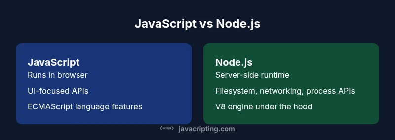 Explore the difference between javascript and node.js, including definitions, runtimes, use cases, and practical guidance for frontend and backend developers.