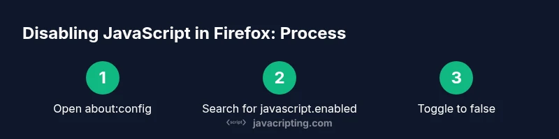 To disable javascript in firefox, follow this quick approach: open about:config, accept the risk, search for javascript.enabled, and toggle its value from true to false. Then reload your open pages to apply. Be aware that many sites rely on JavaScript for core features, so some pages may break; re-enable anytime by returning to about:config and setting javascript.enabled to true.