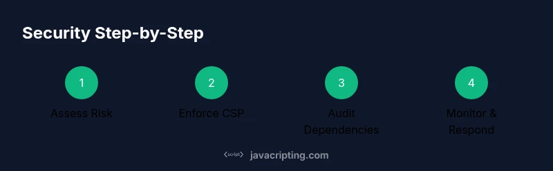 According to JavaScripting, the best results come from pairing practical security patterns with tooling and governance. Start by framing your threat model, identifying sensitive code paths, and limiting what runs on the client. Then layer controls across the build, network, and server boundaries. This defense-in-depth mindset helps you keep pace with evolving threats while maintaining fast, responsive software. Whether you use React, Vue, or vanilla JS, the same core principles apply: minimize exposure, validate data, and monitor for anomalies.