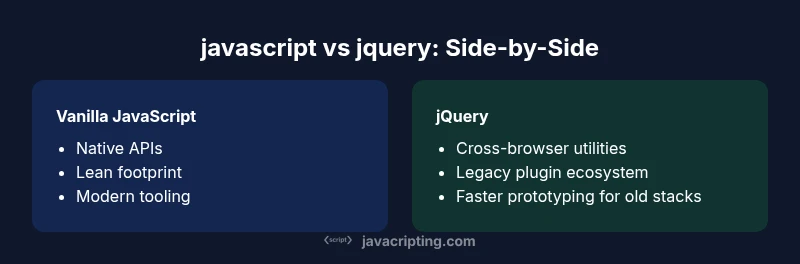 At its core, javascript vs jquery contrasts two approaches to DOM manipulation and client-side behavior: a standards-based language with native APIs vs a battle-tested library that abstracts browser inconsistencies. In 2026, the web platform has matured enough that most tasks can be done reliably with vanilla JavaScript, using modern features like fetch, promise chains, async/await, and refined DOM APIs. jQuery, once ubiquitous, persisted mainly for legacy codebases, quick prototyping, or teams maintaining older stacks where a large jQuery codebase already exists. The JavaScripting team notes that developers should weigh the cost of pulling in a library against the gains in readability and speed of development. When starting fresh, investing in vanilla JS yields long-term benefits: smaller bundles, fewer dependencies, and greater compatibility with contemporary tooling such as module bundlers and tree-shaking. Conversely, in mature projects with a decade of jQuery code, a gradual transition plan is often more pragmatic than an immediate rewrite. The practical conclusion is not to declare a universal winner; rather, align the choice with project goals, team skill, and legacy constraints. In short, javascript vs jquery is a decision about future-proofing, not just current convenience.