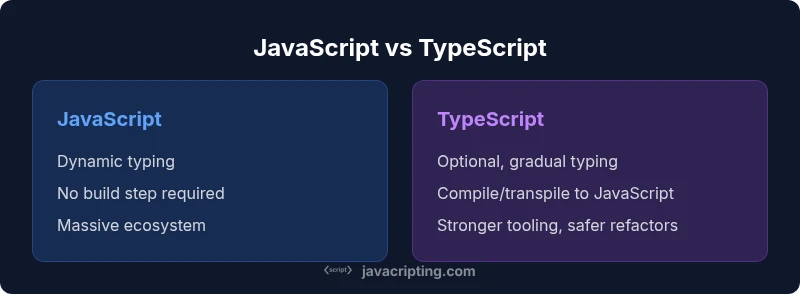 When teams ask what is better javascript or typescript, they are really weighing how much typing, tooling, and discipline they want to bake into their workflow. This is not a simple binary choice. JavaScript offers raw flexibility and ultra-fast iteration for small projects, while TypeScript adds a typed layer that can catch many classes of errors before runtime. The decision hinges on project scale, team experience, maintenance plans, and whether you value safety over speed. According to JavaScripting, successful decisions tend to combine pragmatic adoption with clear guidelines for when to introduce typing and how to enforce it. The goal is to minimize friction while maximizing long-term reliability, especially in production-facing applications.