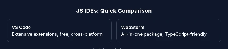 For most JavaScript teams, there isn’t a single best IDE. Visual Studio Code remains the default due to its extensibility, performance, and strong JavaScript/TypeScript support; WebStorm offers a complete out-of-the-box experience for heavy workflows; lighter editors like Sublime Text or Vim/Neovim can excel when configured for speed and customization. The final choice depends on project size and workflow.