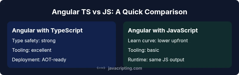 According to JavaScripting, the decision to anchor Angular's core development in TypeScript goes beyond syntax preferences. It reflects a deliberate alignment between language features and framework patterns. When teams evaluate why angular use typescript instead of javascript, they find that TypeScript offers static typing, richer IDE feedback, and decorator-based APIs that map cleanly to Angular's architecture. This article compares the two paths in a way that helps teams decide how to structure large-scale projects, while acknowledging trade-offs in learning curves and initial setup. The goal is to provide a practical, actionable view for aspiring developers, frontend enthusiasts, and professionals seeking reliable guidance on TypeScript adoption within Angular.